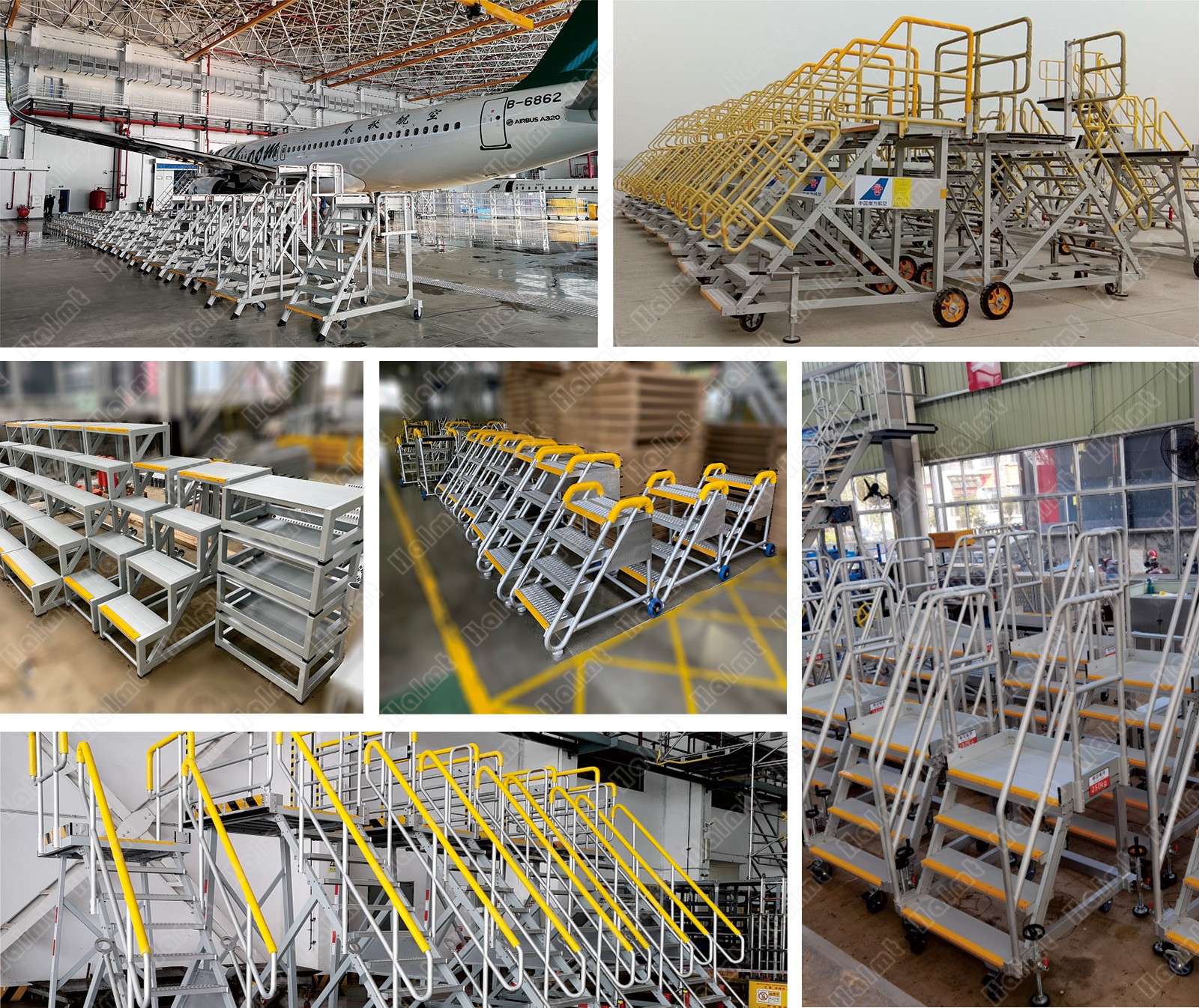 飛機特殊維修梯,主要用于飛機引擎罩下等特殊位置的維修和裝配,實現(xiàn)特殊位置的作業(yè)要求。