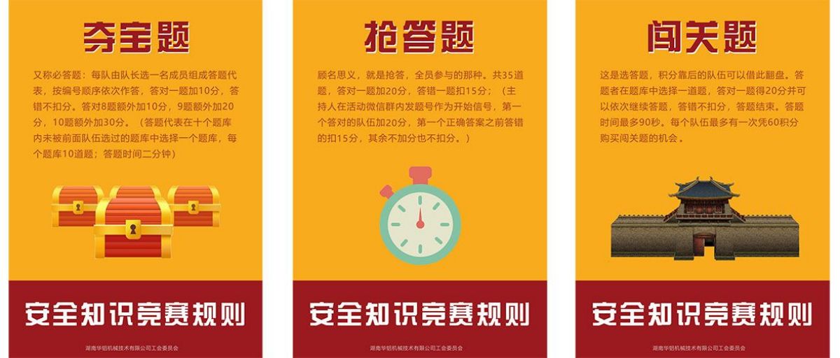 安全生產知識競賽的內容包含生產安全、消防安全、交通安全、食品安全等方面,覆蓋公司各個崗位的安全注意事項。為了增強競賽的參與度和趣味性,我們設置了必答題、搶答題和闖關題。