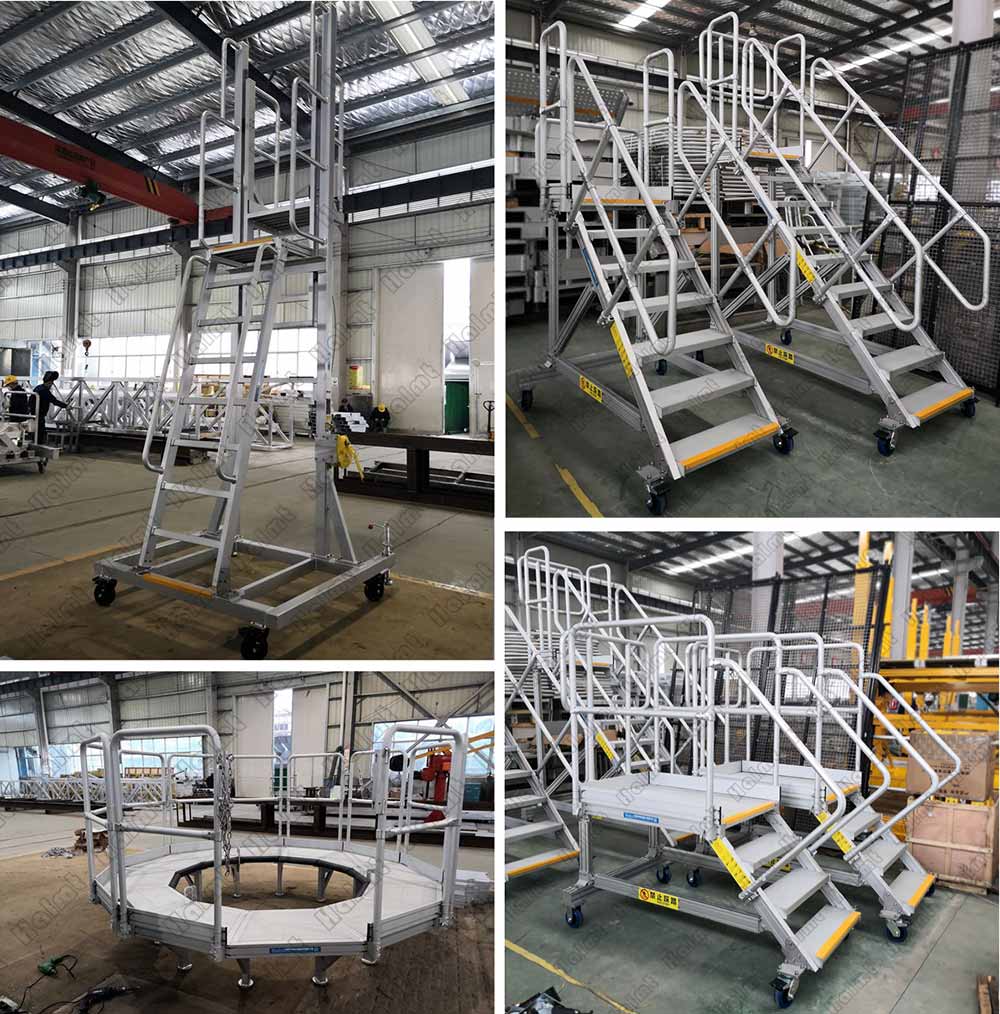 產(chǎn)品包括:多規(guī)格通用移動平臺梯、磁覆組上下轉(zhuǎn)子移動升降工作梯及前軸防護踏步圓形走臺。