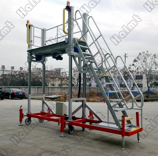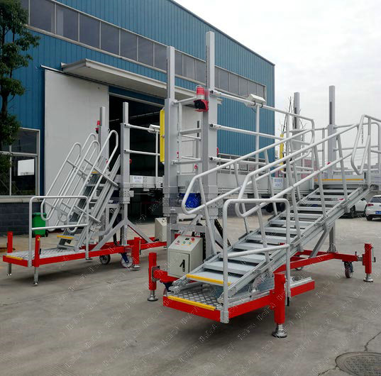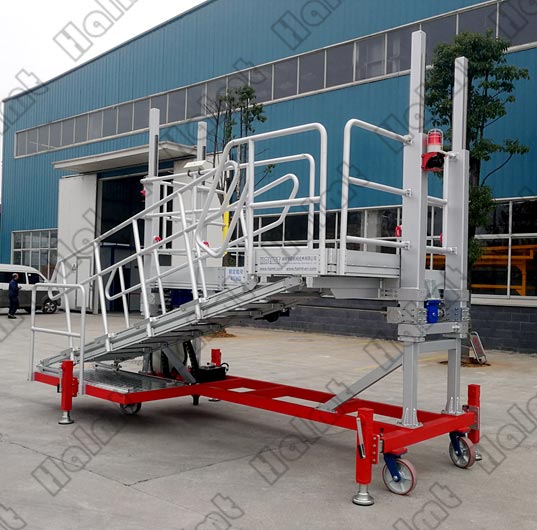 防滑鋁合金齒條踏步和平臺(tái)踏板,全包圍護(hù)欄設(shè)計(jì),首末臺(tái)階警示條設(shè)計(jì),與設(shè)備或建筑接觸處采用防撞橡膠條設(shè)計(jì),更大程度保證人員和設(shè)備的安全。鋁合金結(jié)構(gòu),輕巧美觀,免維護(hù),兩人即能完成轉(zhuǎn)場(chǎng)和移動(dòng)。